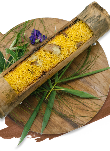 Basmati rice cooked inside bamboo in the open fire to bring extra oomph in aroma and flavor.